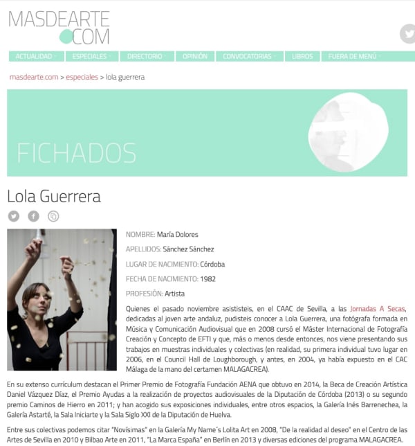 Lola Guerrera graduated in Audiovisual Communication from the University of Málaga in 2004 and completed an International Master in Photography in "Creation and Concept" at the prestigious EFTI School in Madrid in 2008. Additionally, she has musical training in piano since 1999, which adds a rhythmic and auditory dimension to her visual work.